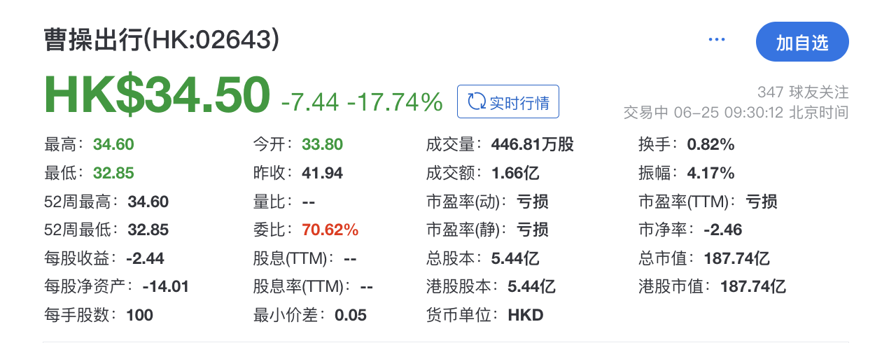 乐居财经 刘治颖 6月25日,曹操出行(02643)在港交所挂牌上市,联席保荐人为海通国际、农银国际、广发证券(香港),开盘跌17.74%,总市值187.74亿港元。