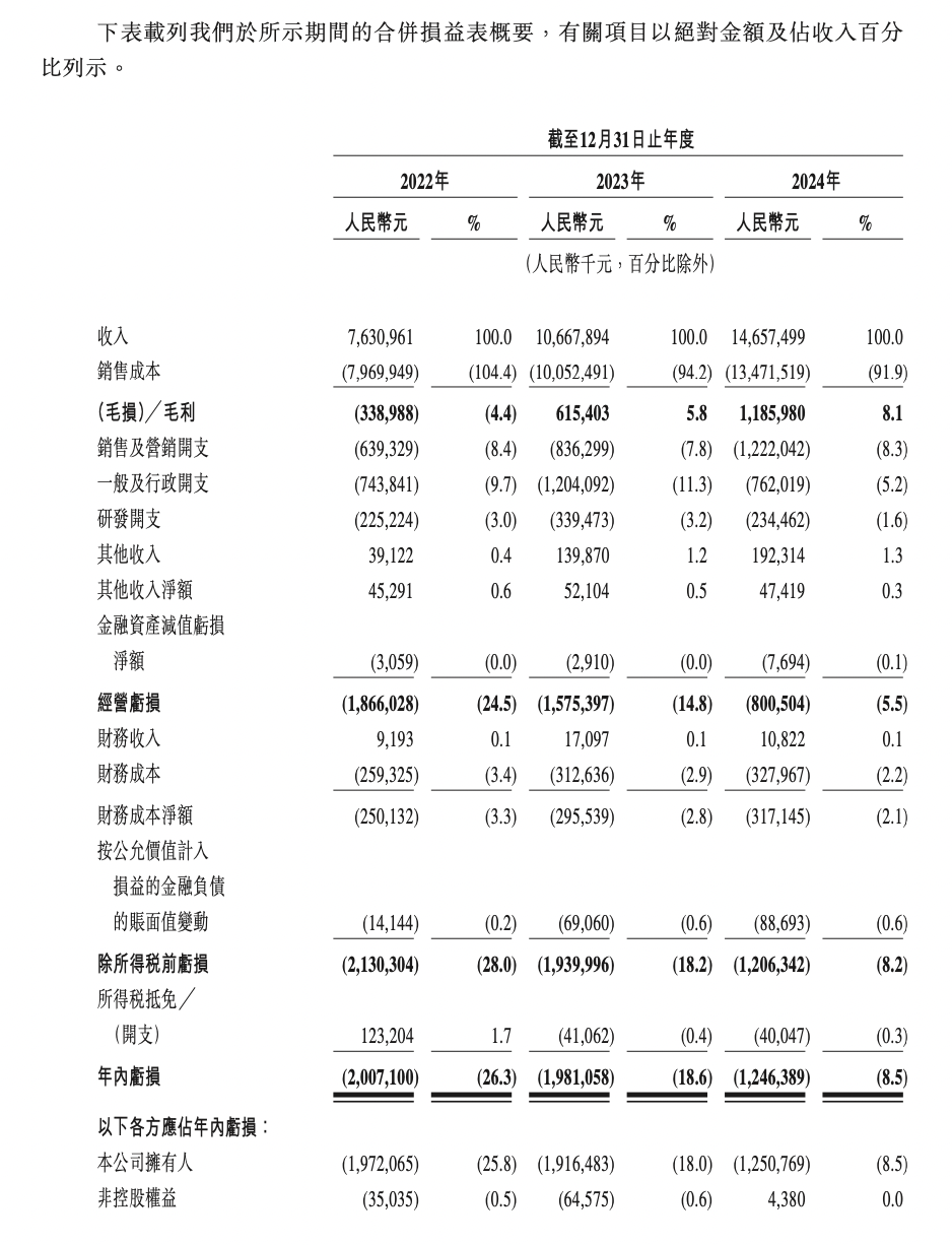 2022年-2024年,曹操出行实现收入分别为76.31亿元、106.68亿元、146.57亿元;年内亏损分别为20.07亿元、19.81亿元、12.46亿元。