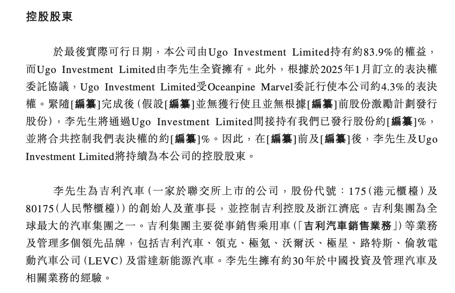 于最后实际可行日期,曹操出行由UgoInvestment Limited持有约83.9%的权益,而UgoInvestment Limited由李书福全资拥有。李书福为吉利汽车创始人及董事长,并控制吉利控股及浙江济底。