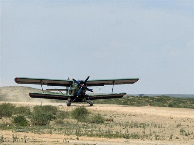 6月24日,在锡林郭勒盟苏尼特左旗巴彦淖尔镇浑善达克沙地歼灭战飞播治沙现场,伴随着发动机的轰鸣声,满载灌草种子的飞机呼啸着冲向天空,开始执行飞播治沙任务。