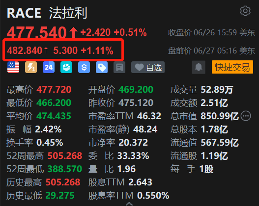 美股异动丨法拉利盘前涨超1% 多家机构唱好 最高看至566.81美元