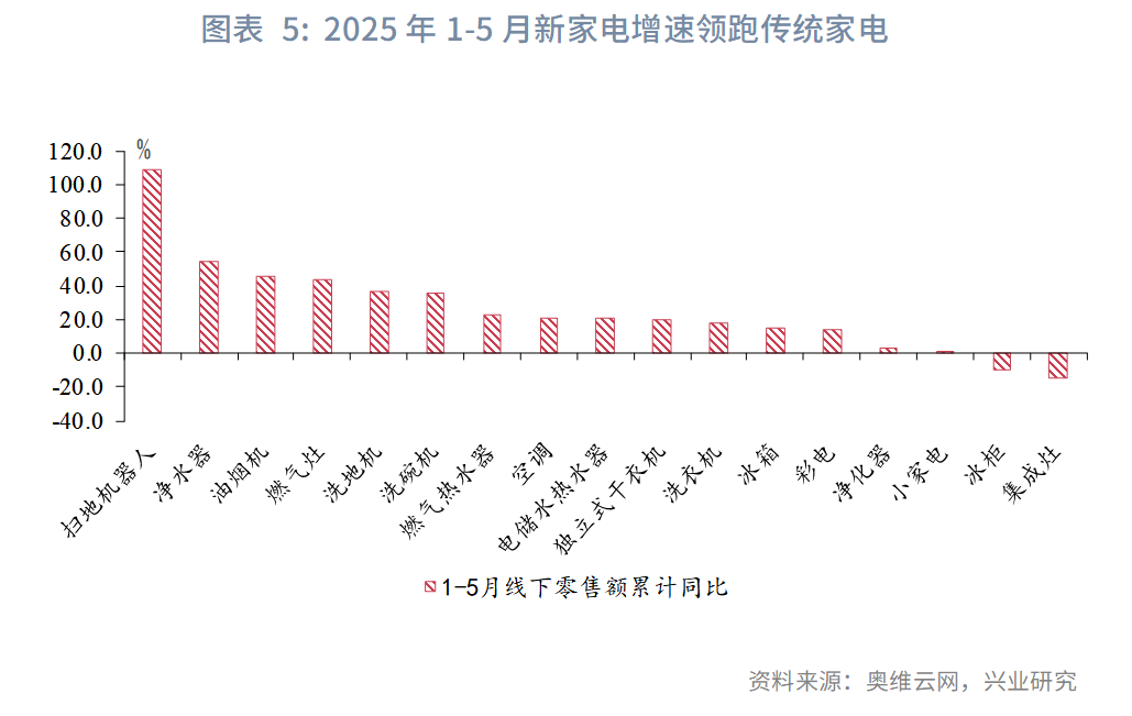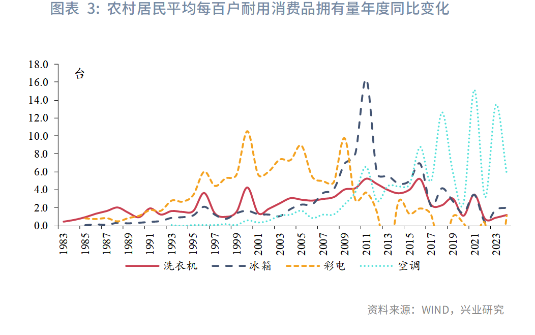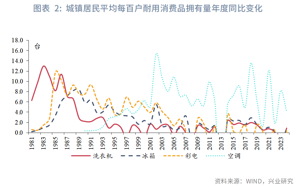 原因来自三方面。一是新一轮换新周期的启动。2009年至2012年期间,得益于2009-2010年以旧换新与2007-2013的家电下乡政策,我国城乡居民平均每百户家电拥有量集中快速提升。距离上一轮家电推广已过去十年以上,考虑到大多数家电产品的安全使用年限,本轮促消费政策及时唤醒了潜在的换新需求。二是新型家电的崛起。随着生活节奏加快,劳动替代率高的智能家电热度提升;同时消费理念向绿色化、情感型转变,消费者更加注重品质提升,以扫地机器人、洗地机、洗碗机等为代表的新型家电消费快速增长。三是房地产止跌回稳的溢出效应。2024年9月后房地产销售出现回暖,尤其是二手房销售增长较快,带动了城镇家电消费增速反超乡村。