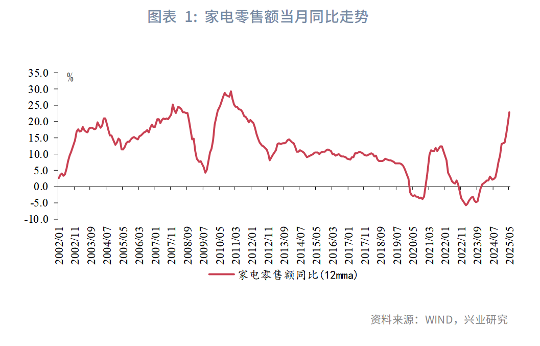 本轮以旧换新表现最亮眼的无疑是家电产品。截至2025年5月,限额以上单位商品零售中,家用电器和音像器材类累计同比增长30.2%,在所有品类中增速最高;其中5月家电零售当月同比增长53%,刷新2001年有统计以来最高增速。在家电保有量已经较高的情况下,以旧换新补贴缘何可以产生如此强的提振效果?