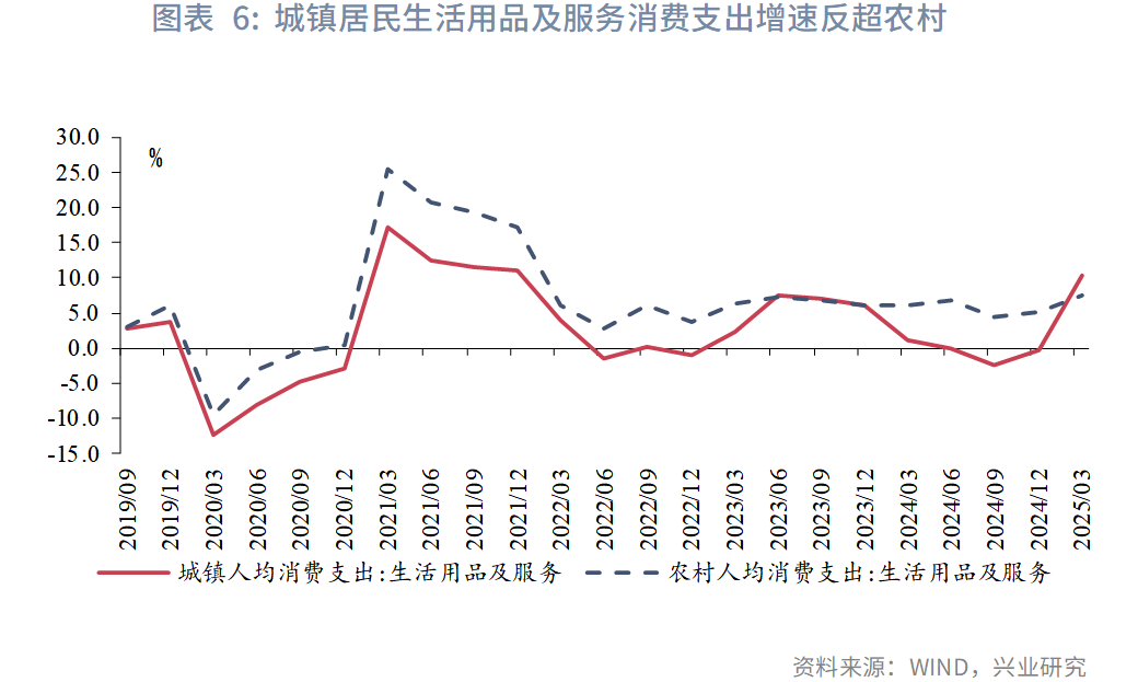 2012年以来,城镇社会消费品零售增速整体慢于乡村。对于家电等传统消费品,城镇保有量较高,市场相对饱和,因此增速亦整体落后于乡村。对比城乡生活用品及服务领域的人均消费支出增速,2019年第三季度以来城镇增速整体低于农村增速,然而2025年第一季度以旧换新加力扩围之后城镇实现反超。