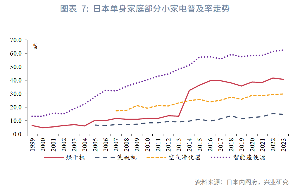 日本的经验显示,随着人均消费水平的提高以及生活节奏的加快,品质生活类以及劳动替代类小家电在日本单身家庭的渗透率整体走高。其中,2014年前后烘干机拥有率提高至30%以上,智能座便器普及率从1999年的不足14%提升至2023年的62%,表明增长空间显著。