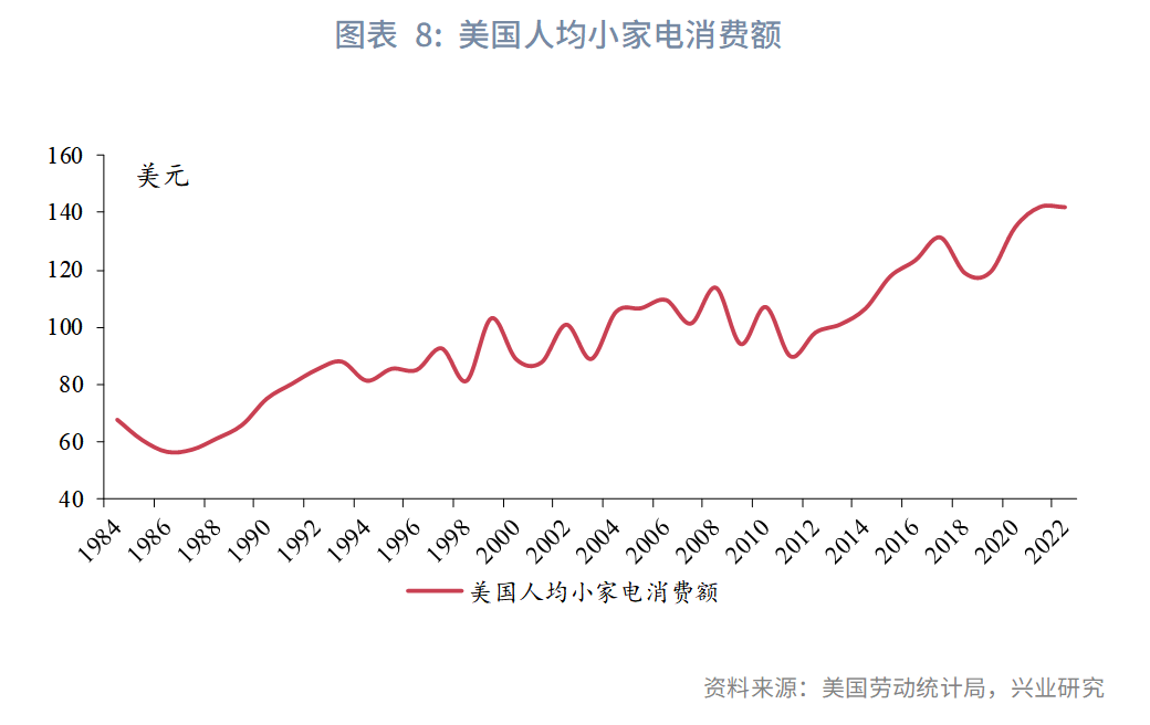 美国劳动统计局公布了美国自有住房群体和租房群体用于小家电的人均支出,按照美国住宅拥有率加权后,可大致推算美国人均小家电消费额。根据《2022全球小家电趋势洞察白皮书》,截至2020年我国小家电人均消费额约为35美元。考虑到我国人均GDP约相当于美国上世纪80年代水平,如果我国人均小家电消费额提高至美国同阶段可比水平(61美元),乘以我国人口基数,则小家电零售额将增加2668亿元,约相当于2024年家电零售额的10.6%。其中,穿戴类健身设备、保健按摩家电、沙发/布艺/地毯清洗机、宠物家电等均具有巨大的增长潜力。