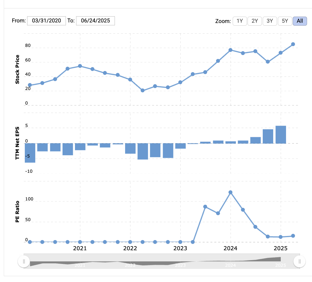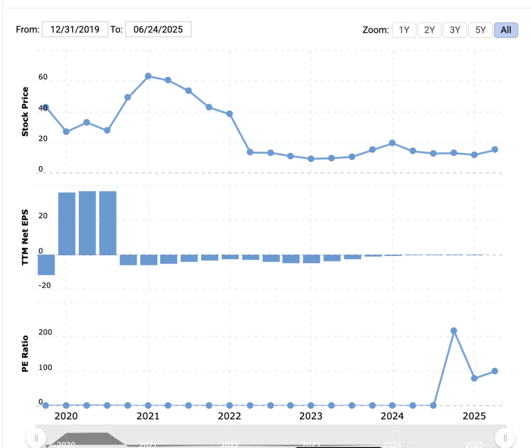 市盈率传递的信息有些复杂,但总体而言仍然是积极的。Lyft 一直难以实现 GAAP 盈利,并在经历了数年的亏损(净收入仅为 500 万美元)后,于 2024 年实现了盈利。然而,实现盈利对该公司而言是重要的一步。直到最近,其每股收益(EPS)在相当长的一段时间内一直为负,如下图所示。