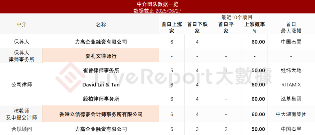 据LiveReport大数据统计,BBSB中介团队共计7家,其中保荐人1家,近10家保荐项目数据表现一般;公司律师共计3家,综合项目数据不尽如意。整体而言中介团队历史数据表现无特别之处。