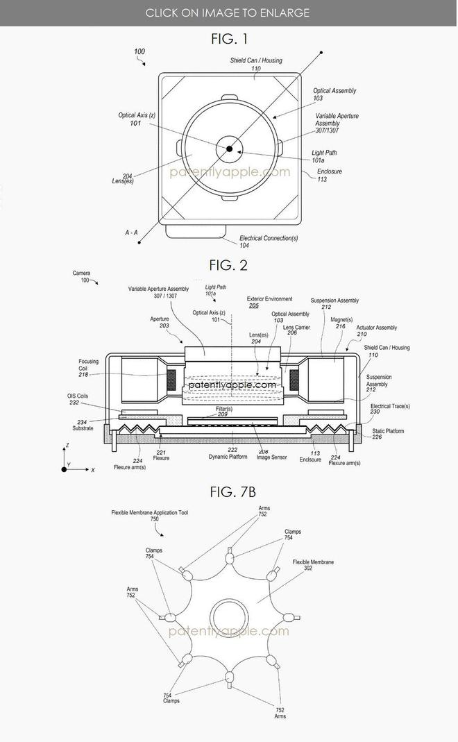 IT之家援引博文介绍,苹果的专利申请描述了一种可变光圈系统,主要面向紧凑型相机模块,适用于智能手机等设备,摒弃了传统的机械叶片,转而使用柔软、灵活的薄膜,这种弹性薄膜支持拉伸,通过扭曲和弯曲以打开或关闭光圈。