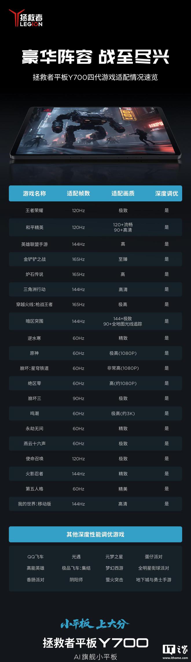 IT之家 6 月 29 日消息,联想拯救者官方微博本周公布了拯救者平板 Y700 四代游戏适配情况,其中 20 款游戏高帧 / 高画质适配、共计 30+ 游戏深度性能优化。
