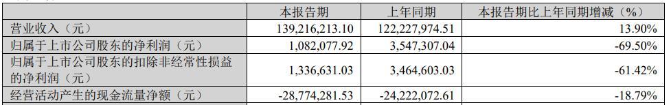 2025年一季度,共同药业实现营业收入1.39亿元,同比增长13.90%;归属于上市公司股东的净利润108.21万元,同比下降69.50%;归属于上市公司股东的扣除非经常性损益的净利润133.66万元,同比下降61.42%;经营活动产生的现金流量净额-2877.43万元,上年同期为-2422.21万元。