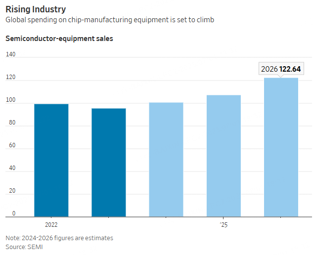 With global outlays on equipment set to top $100 billion this year, that's a lot of revenue to look forward to. Yet investors haven't given chip-equipment makers the plaudits they have showered on AI chip designers, from Nvidia to Advanced Micro Devices and Broadcom, as well as chip producers like Taiwan Semiconductor Manufacturing Co.