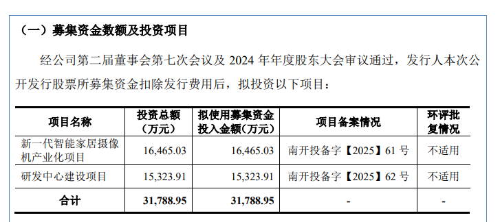 华来科技本次IPO拟募集资金为3.18亿元,其中16465.03万元用于新一代智能家居摄像机产业化项目,15323.91万元用于研发中心建设项目。