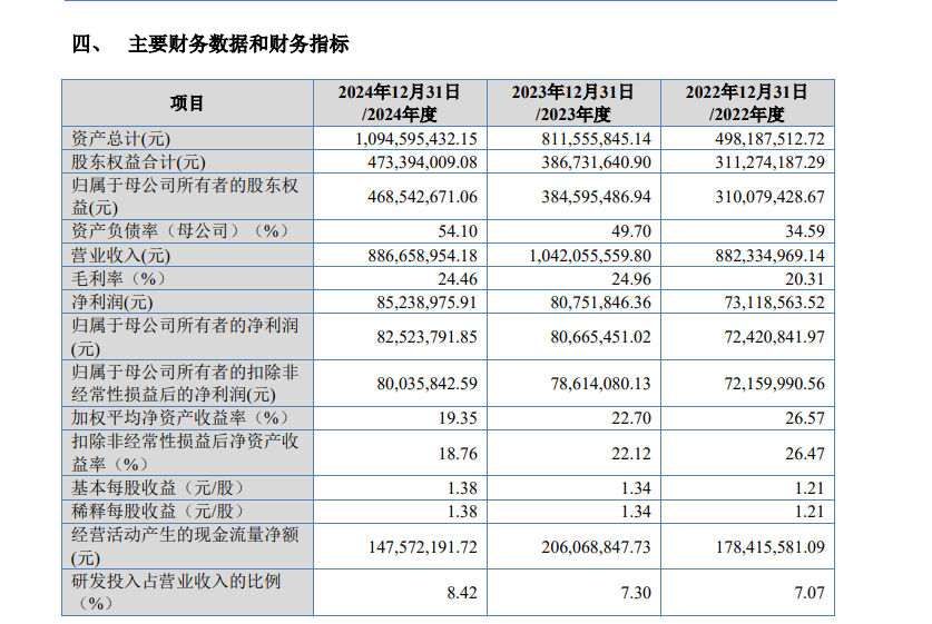 2022年-2024年,华来科技实现营业收入分别为8.82亿元、10.42亿元、8.87亿元,实现归属于母公司所有者的净利润分别为7242.08万元、8066.55万元、8252.38万元。