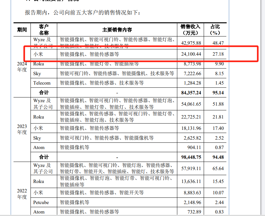 报告期各期,华来科技来自于前五大客户的收入占当期营业收入的比例分别为94.43%、94.48%和95.14%,集中度较高。2022年-2024年,小米位列前三大客户。