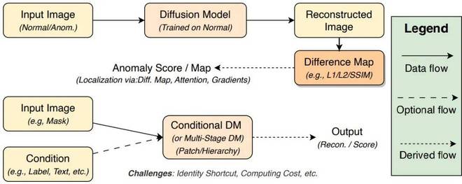 图 3 基于扩散模型的异常评分机制基于 DMs 的异常检测通过建模数据分布的内在结构,将异常定义为与正常数据模式的显著偏离。根据异常评分机制不同,可分为三大核心范式,如图 3 所示。