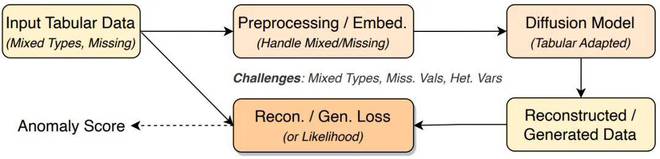 图 7:表格异常检测框架示意图。该框架展示了处理包含混合数据类型(如数值型、分类型)的表格数据的典型流程。数据首先经过专门的预处理和嵌入模块,然后输入到适用于表格数据的扩散模型中,最终通过计算重构损失来识别异常。