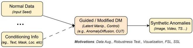 异常生成(Anomaly Generation, AG)的主要动机是解决现实世界中异常样本稀缺的根本性难题。扩散模型凭借其卓越的生成能力,可以创造出逼真且多样的合成异常。该技术以正常数据为 “种子”,通过引入文本描述、掩码或在潜空间进行特定操作等条件化引导,精确地控制生成异常的类型、位置和严重程度。这些生成的异常数据不仅可以用于扩充训练集以增强检测模型的泛化能力,还能作为 “陪练” 来系统性地评估和提升模型的鲁棒性,并为自监督学习范式提供了宝贵的训练信号。
