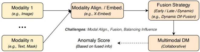 多模态异常检测(Multimodal Anomaly Detection, MAD)通过融合来自不同数据源(如图像、文本、传感器数据)的互补信息,显著提升了检测系统的准确性和鲁棒性。其核心挑战在于如何有效对齐和融合异构的模态信息。综述总结了三种主流的融合策略:早期融合在输入层即合并特征;晚期融合在决策层结合各模态的独立输出;而动态融合则能根据输入数据的上下文自适应地调整各模态的权重。协同扩散(Collaborative Diffusion)等先进框架通过构建共享的嵌入空间和动态融合模块,有效解决了模态对齐和信息不均衡的问题,在工业检测、智能监控等场景中展现了巨大潜力。