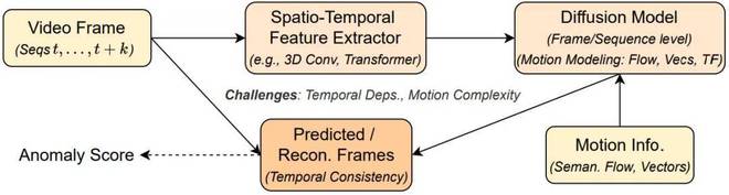 图 5:视频异常检测框架示意图。该框架集成了时空特征提取与运动建模,通过光流或 Transformer 等技术将运动信息融入扩散模型,以有效识别空间外观和时间演变中的异常。