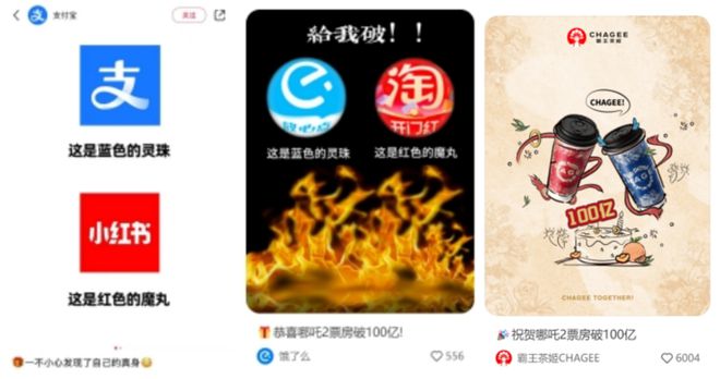 “自古红蓝出CP”。很多品牌虽然没有与官方联名,但也借着哪咤和敖丙的CP营销蹭了一波热度。比如支付宝×小红书、饿了么×淘宝等,纷纷寻找自己的搭子,玩起了蓝色灵珠×红色魔丸的CP梗。再比如霸王茶姬,虽然没有找到合适的品牌搭子,但用自己的红蓝产品包装组CP也照样蹭上了热度。