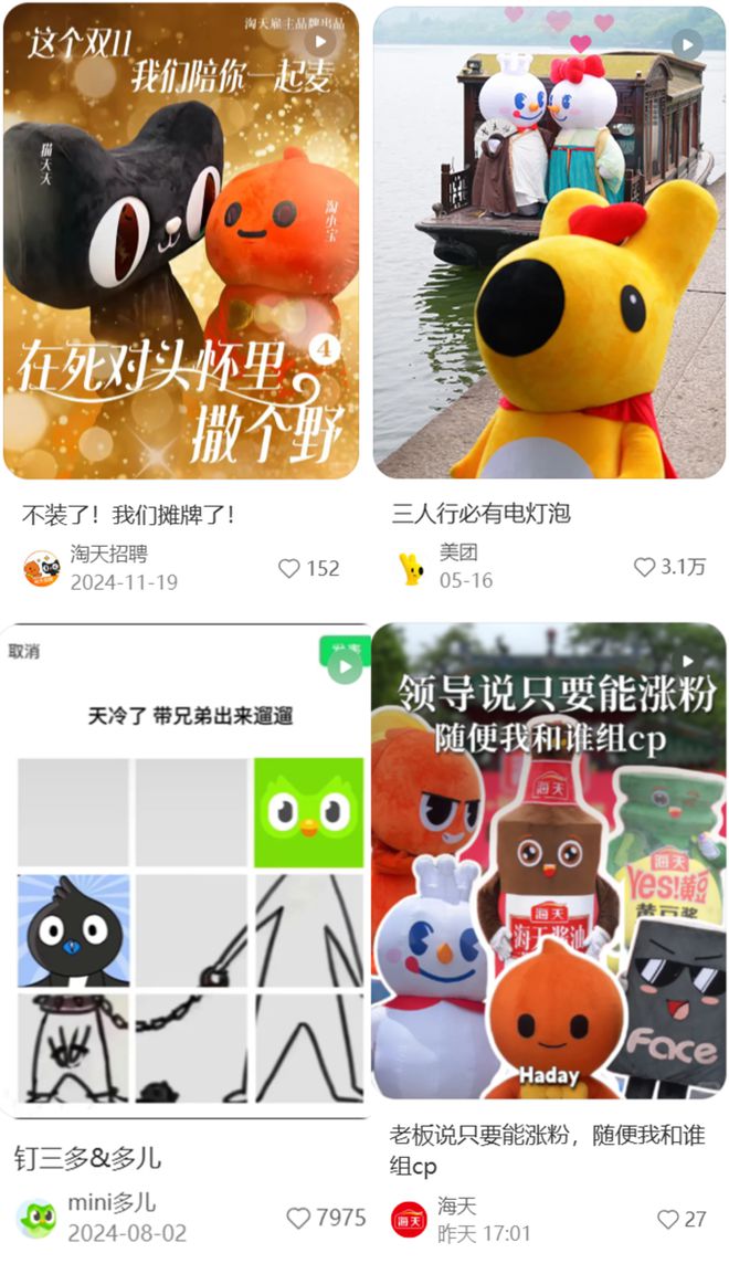 不知道从什么时候起,品牌们的IP吉祥物们有了自己的“爱恨情仇”。淘宝的淘小宝和天猫的猫天天演上了系列短剧《在死对头怀里撒个野》;美团的团团在蜜雪冰城的雪王和雪妹面前当起了“电灯泡”;邻国的多儿和钉钉的钉三多上演起了《霸道多儿强制爱》;海天的海小天着急忙慌地全网征集CP搭子……