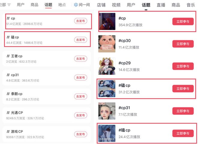 小红书上,话题#CP浏览量51亿+,讨论量2698万+;话题#嗑CP浏览量44亿+,讨论量1486万+。此外,还有很多具体的CP话题,如#光遇CP、#藕饼CP、#喜美CP、#新兰CP、#航猪CP等,也都有数千万的浏览量和数十万的讨论量。抖音数据更甚,话题#CP播放量超350亿,各种衍生话题,如#新兰CP、#高雅CP、#龙王CP等播放量也高达数十亿。如此庞大的数据流量,揭示了嗑CP早已超越单纯的娱乐行为,演变成一种全民参与的文化现象,成为融入年轻人日常的生活方式。
