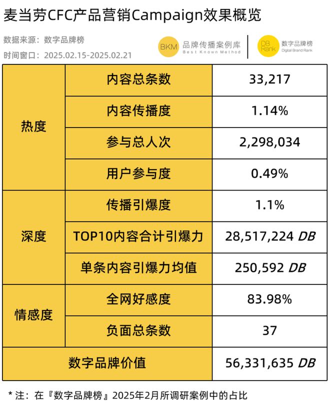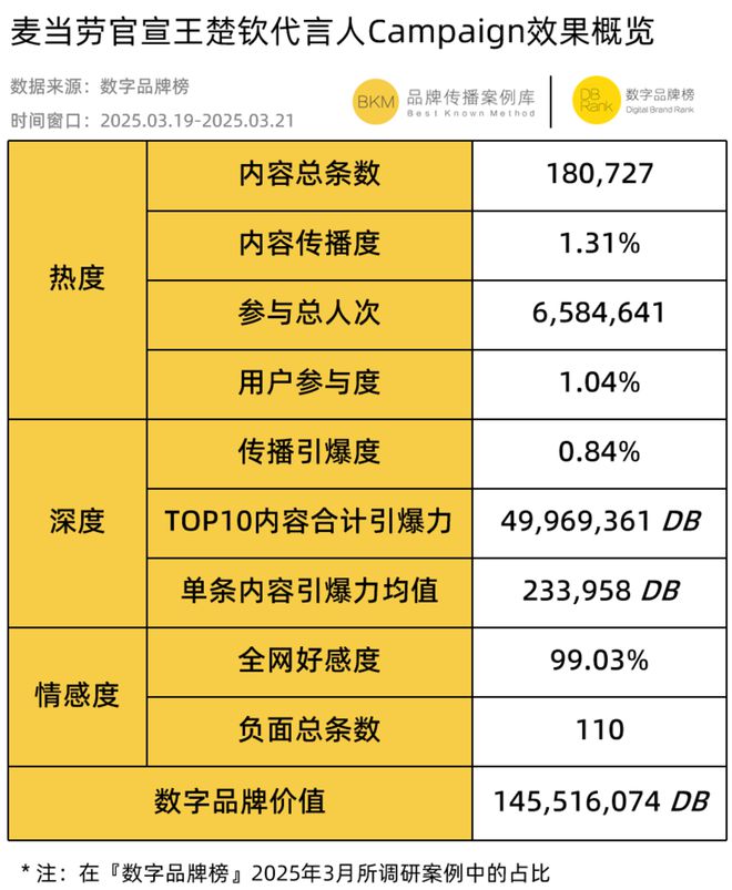 肯德基麦当劳的玩法更是更令人拍案叫绝。2024年底,肯德基官宣孙颖莎成为全新品牌代言人,推出联名套餐以及定制周边,仅官宣当天微博话题阅读量便突破2.3亿。麦当劳也不甘示弱,3个月后,官宣王楚钦为品牌代言人,甚至连官宣文案都很有CP感,肯德基打出了“天生对味,一拍即合”,麦当劳就打出了“向上生长,我就喜欢”,读起来毫无违和感。当相爱相杀的“麦肯CP”分别签约“莎头CP”,粉丝们是越嗑越上头,原本是两个看似独立的代言事件,反而借助CP营销实现了流量共振。在‘数字品牌榜’调研案例中,麦当劳官宣王楚钦代言人Campaign传播表现如下: