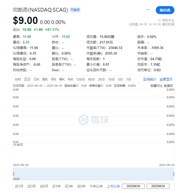 截至首日(2025年6月30日)收市,司凯奇(SCAG)收报每股9美元,不涨不跌,目前市值约64.75亿美元。