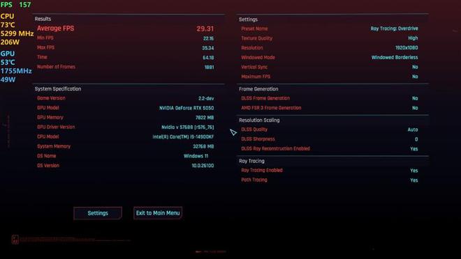 在《赛博朋克:2077》中,使用光线追踪:超速预设并打开DLSS帧生成,记录游戏帧数。