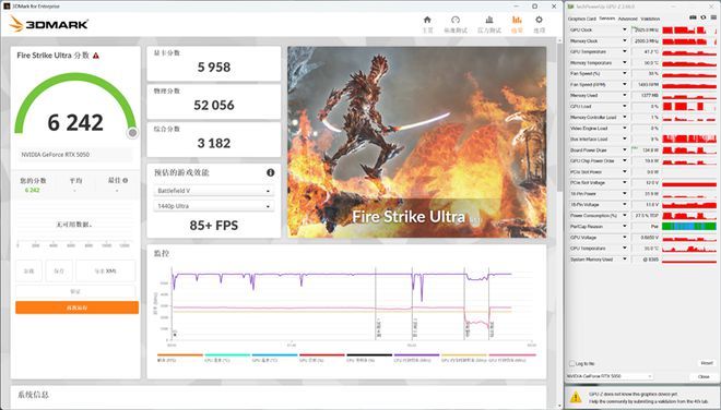在3DMark的Fire Strike Ultra(DX11+4K渲染分辨率)测试中,总成绩为6242,其中显卡分数为5958。