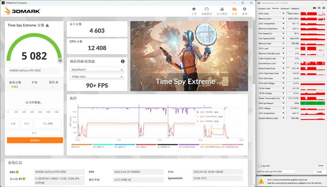 在3DMark的Time Spy Extreme(DX12+4K渲染分辨率)测试中,总成绩为5082,其中显卡分数为4603。