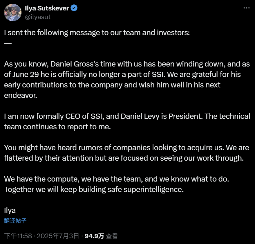 Ilya 的自宣坐实了 Meta 曾经试图全资收购 SSI 的传闻,另一方面,Daniel Gross 的离开又让这家成立近一年的公司的前景变得更加不确定。