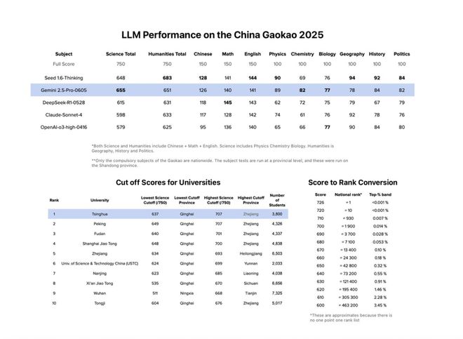 最新的高考测试中,Doubao-Seed-1.6-thinking、Gemini 2.5 Pro均已达到清华录取线,超越99%的人类考生。