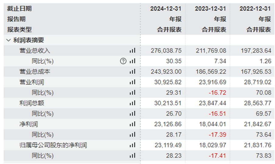 从业绩数据来看,同富股份的表现也难以让人完全信服。在营收和利润方面,2022年~2024年(报告期内),公司营业收入分别为19.73亿元、21.18亿元、27.60亿元,同比变动1.26%、7.34%、30.35%;净利润分别为2.18亿元、1.80亿元、2.31亿元,同比变动73.64%、-17.39%、28.17%。营收复合增长率仅为18.29%,低于30%,净利润复合增长率更是只有2.9%,处于个位数水平。并且,净利润增速波动极大,上一期增速为-17.39%,而近一期却骤升至28.17%,如此大幅的波动,让人对其盈利的稳定性产生质疑。