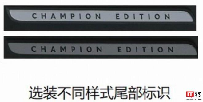 IT之家注意到,系列车型已现身工信部,采用磨砂质感灰色车漆,车身新增“CHAMPION EDITION”专属标识,同时车辆可选装彩色卡钳,带有全新造型轮毂