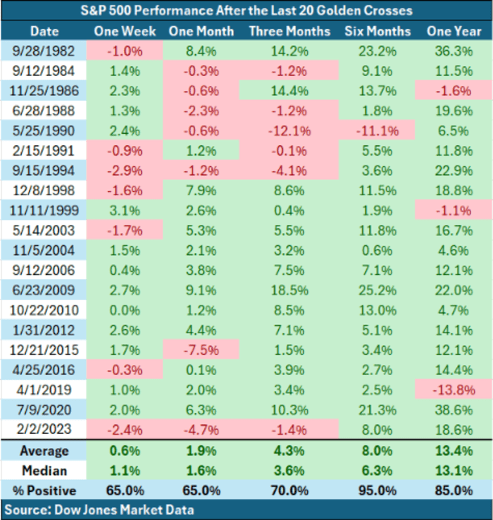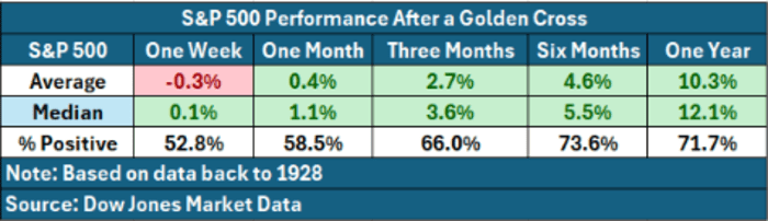 History shows golden crosses have reliably presaged further gains, according to Dow Jones data. After a golden cross, the S&P 500 was higher one year later more than 71% of the time, with an average one-year return of more than 10%, according to data going back to 1928. By comparison, the average 12-month return for the index during any 12-month period since 1928 has been about 8%.