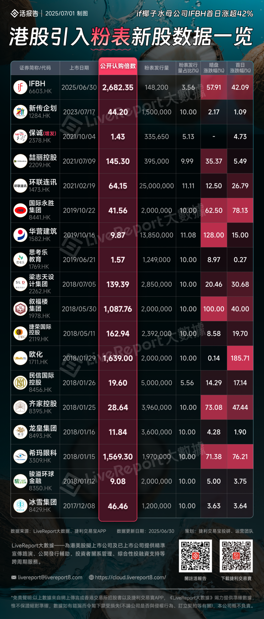 据LiveReport大数据,最近刚上市的新股IFBH(6603.HK)久违地提供了“粉表”申购,并在上市首日拥有不错的市场表现(首日涨超42%)。这引起部分老打新人的讨论,甚至喊出“有粉表的公司,就可以无脑打新”的口号。