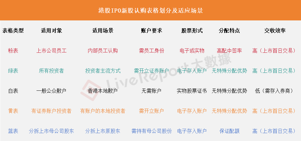 来源:IFBH 公告香港新股申购除了“粉表”外,还有绿表(电子认购、EIPO)、白表、黄表、蓝表,对应的投资者及适用场景也各有不同。