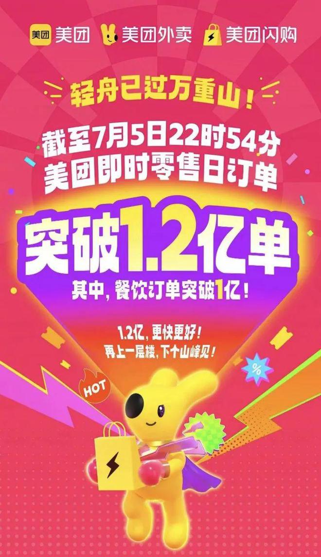 美团的战报显示,截至7月5日22时54分,美团即时零售当日订单已经突破了1.2亿单,其中餐饮订单已超过1亿单。