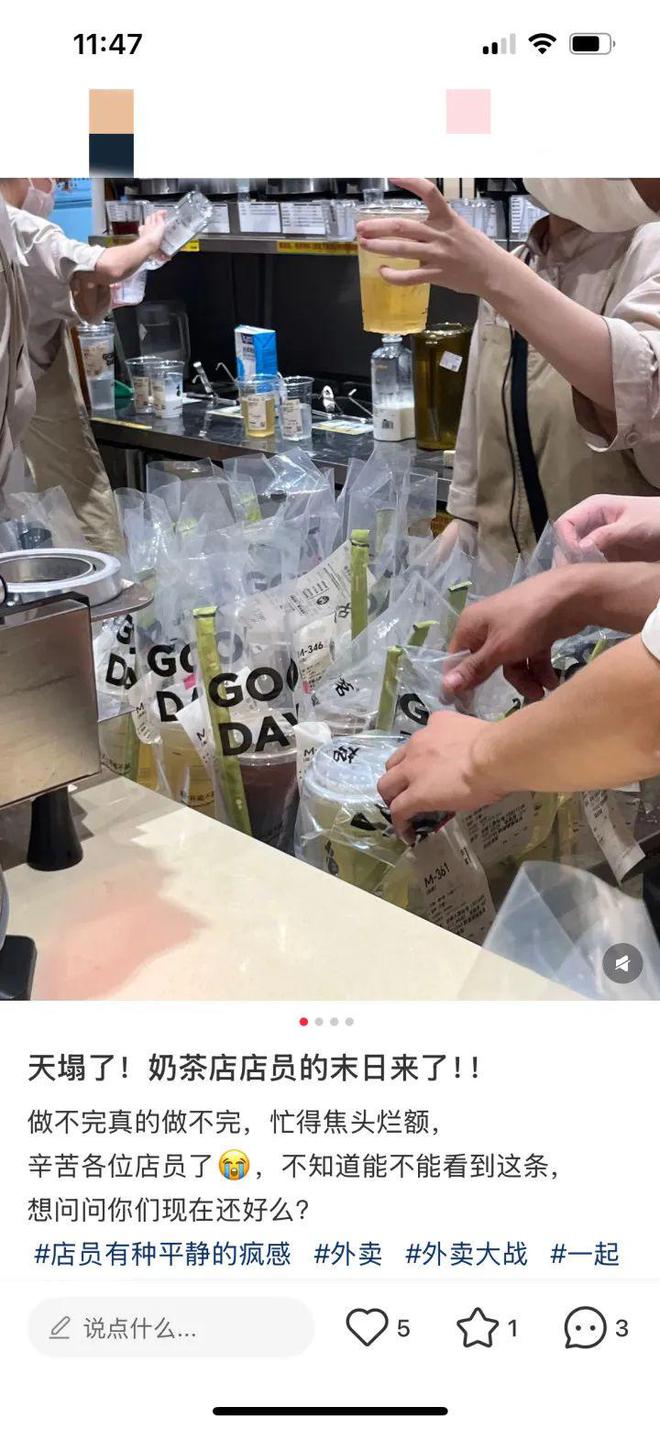 这场外卖大战,引发了奶茶店“爆仓”,不少店员在社交媒体上吐槽:“天塌了”。