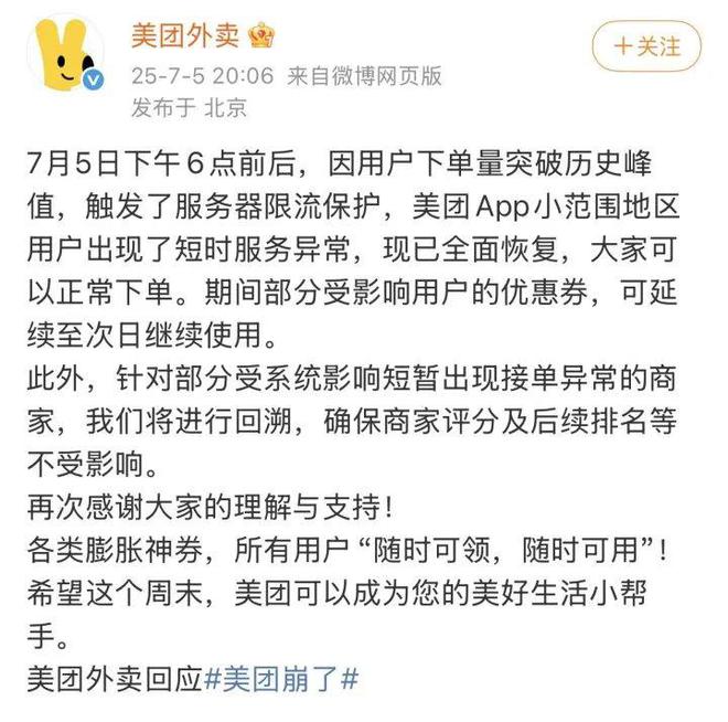 随后,大量用户涌入淘宝闪购、美团两大平台下单,订单剧增,美团一度“崩了”。昨晚8:06分美团外卖通过微博回应:用户下单量突破历史峰值,触发了服务器限流保护。随后#美团外卖用户下单突破历史峰值#登上微博热搜榜。