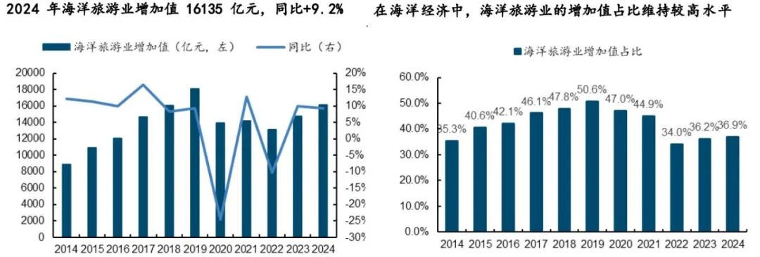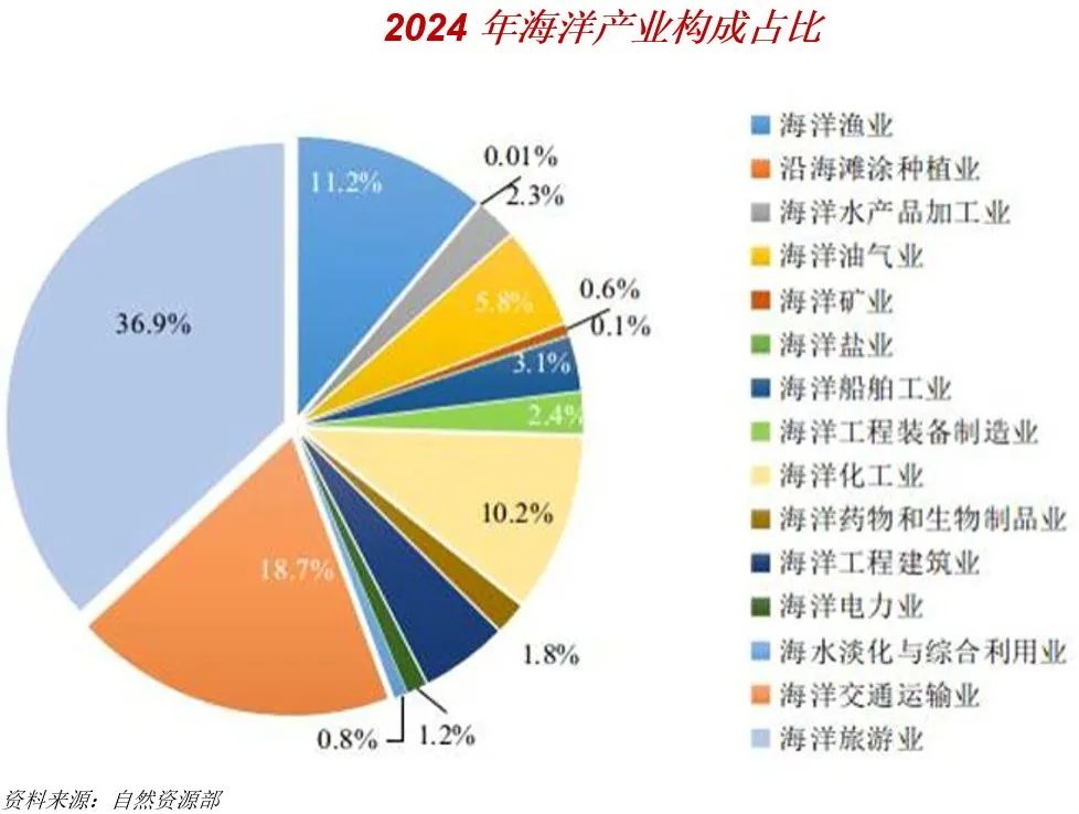 自然资源部数据显示,2024 年海洋旅游业增加值 16135 亿元,增长 9.2%,这么大的体量还能保持高增速。它在海洋产业中的占比也从 2023 年的 36.2% 升到了 36.9%。
