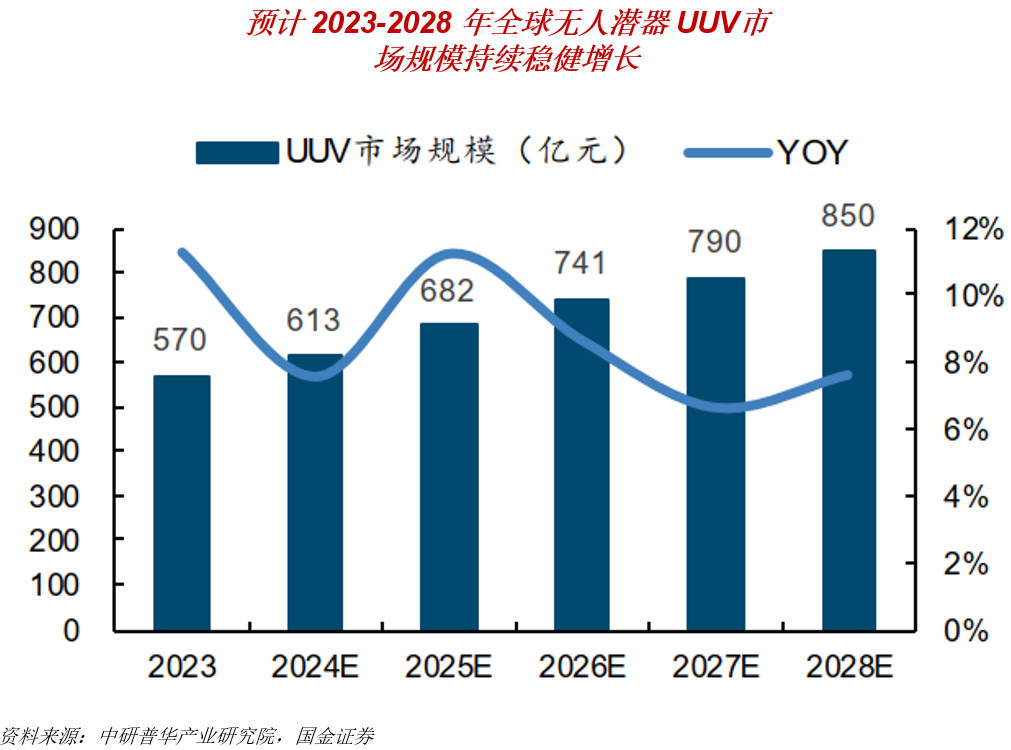 全球无人潜水器(UUV)市场稳步扩大,2023 年规模 570 亿元,预计 2028 年达 850 亿元,年均增速 8.32%。中国市场增长迅猛,2021 年水下机器人市场 87.4 亿元,2022 年 110.2 亿元(同比增 26.1%),2023 年 140 亿元。政策利好下,国内的UUV未来有望持续高增。