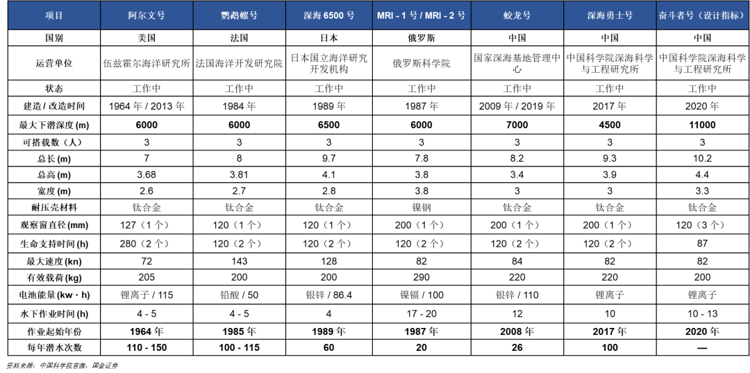 看国外知名载人潜水器的技术参数,我国的蛟龙号、深海勇士号、奋斗者号都达到了世界先进水平,这也印证了我国确实站在了深海科考的第一梯队里。