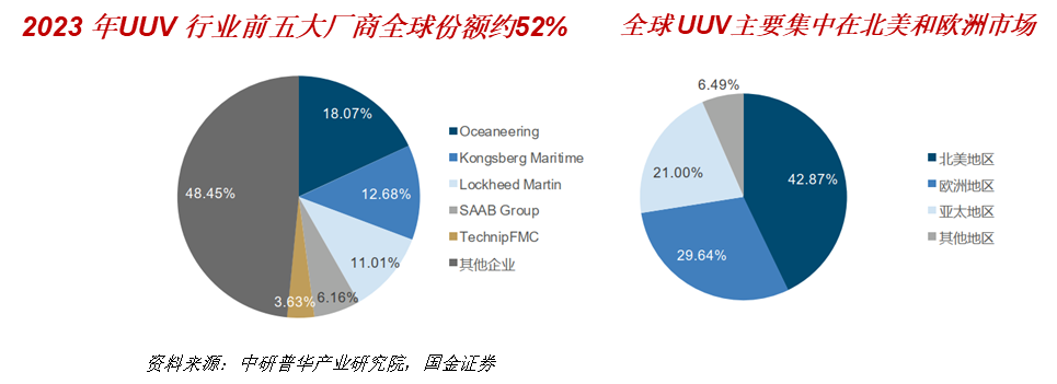 行业竞争集中,北美、欧洲为主要市场。全球海上能源无人潜水器前五厂商占比约 52%,Oceaneering(18.07%)、Kongsberg Maritime(12.68%)领先。2023 年北美市场占 42.87%,欧洲占 29.64%。