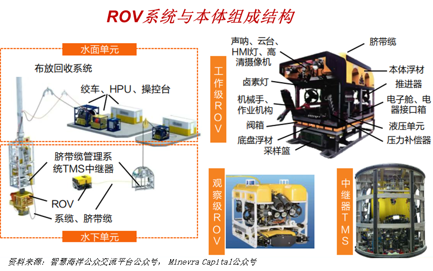 ROV 系统类似 “分体式设备”,分水面和水下两个主要部分。水面部分有布放回收装置和集控操作台,好比 “地面控制台”;水下部分包括 ROV 本体和中继器,本体由浮力材料、动力推进等系统组成,中继器则能隔离母船运动对 ROV 的拖拽。水面和水下通过电缆光缆连接,用来传递控制指令、探测图像等信息。