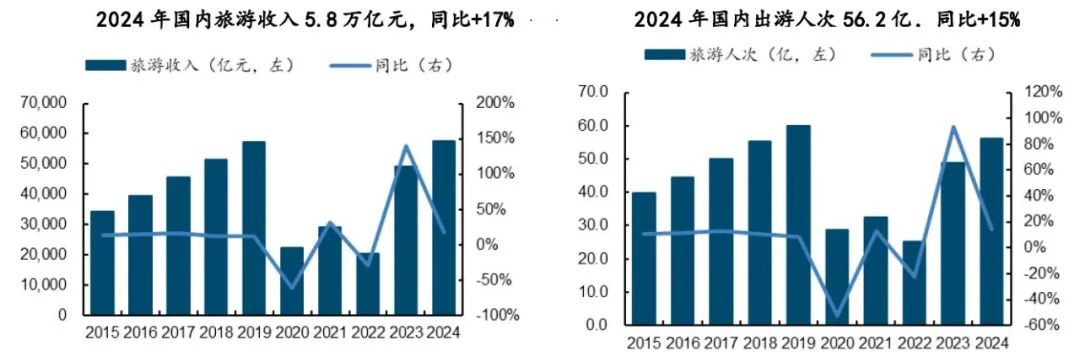 2024 年我国旅游市场继续回暖,出游和消费都在涨。文旅部数据显示,国内出游 56.2 亿人次,比上年多 7.2 亿,增长 14.8%;旅游总收入 5.8 万亿元,增加 0.8 万亿元,增长 17.1%;每次出游平均花 1024 元,比上年多 19 元,增长 1.9%。