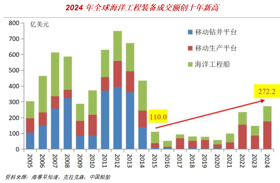 2024 年海工装备订单火了,金额创十年新高,达 272.2 亿美元,同比涨 85.1%,共成交 215 艘 / 座。装备价格也超 2014 年峰值,因为船厂忙着造普通船,接海工订单的意愿低,产能有限反而撑起了价格。比如超深水钻井船估价 7 亿美元,恶劣海况半潜式钻井平台 7.5 亿美元,同比分别涨 12% 和 15.4%。