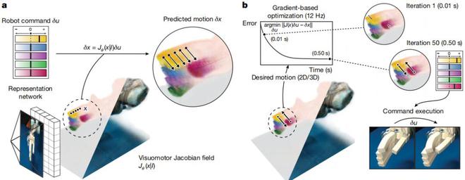 为此,他们提出了上述这种利用深度神经网络将机器人的视频流映射到其视觉运动雅可比场的方法。